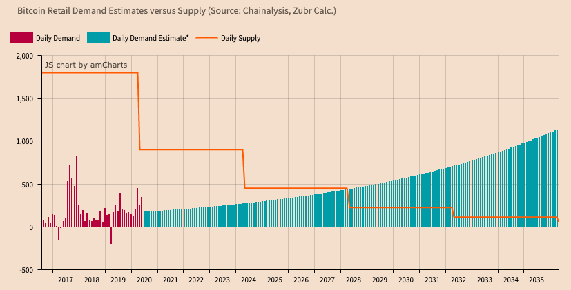 Currently, 900 bitcoins are extracted daily. This figure will be reduced to 450 units during the next Hawking, which will take place in 2024. According to ZURB's forecast, after the next Hawking, the average daily demand for micro-investors will exceed 250 bitcoin units; That means half of the bitcoins mined after the next Hawking will go to small investors.