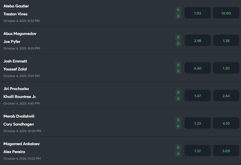 This is so amazing card. First of all, Pereira is amazing and his every fight is a joy to watch because of his brutal knockouts but here is Merab Dvalishvili, which is one of my all-time favorite fighter. Procházka is cool too. So, the first from the top 3 fight will be Procházka VS Rountree, then Dvalishvili VS Sandhagen and then Ankalaev VS Pereira, right? This is what my bet looks like: Prochazka wins, Dvalishvili wins and Pereira wins but I'm not sure about this last one because I have no idea how well Pereira was preparing for this fight. I'm super confident about Dvalishvili, that's all I know. I'm sure Procahzka will also win too because he is very hungry and wants to fight Pereira.